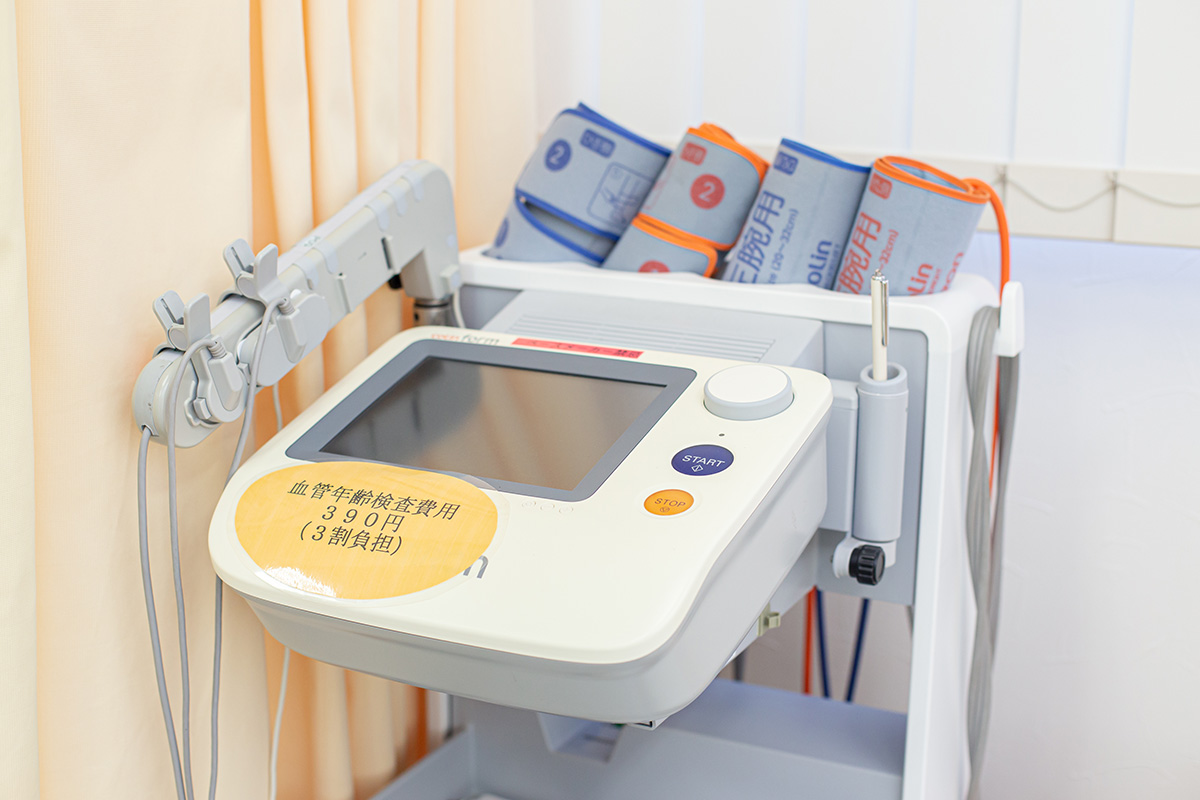 血管年齢、動脈硬化判定、上下肢の血流障害判定が可能です。特に動脈硬化は脳梗塞や心筋梗塞の危険因子です。高血圧や高脂血症、糖尿病などの慢性疾患を治療中の方、手や足に冷感・しびれのある方は、一度検査をおすすめします。